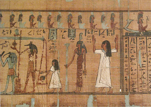 Abb. oben: Ausschnitt aus einem Totenpapyri zur Zeit des Neuen Reichs. Ganz links die Waage der Gerechtigkeit mit Thot und Anubis; in der Mitte die Göttin Maat mit Feder auf dem Kopf und Papyrusdolde-Stab in der einen Hand, in der anderen das Symbol Anch. In weißem Gewand der Verstorbene. )