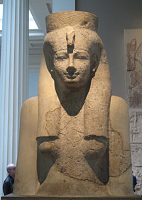 Abb. links: Königin Ahmes Meritamun, Gemahlin von Amenhotep I., 18. Dynastie. Mit üppiger Perücke.