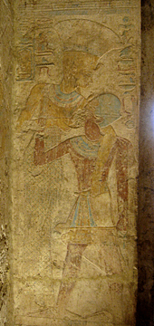 Abb. oben: Darstellung der Anuket auf einer Säule mit dem Pharao (Ausschnitt). Relief aus dem Tempel von Beit el-Wali. (Foto: Elvira Kronlob)
