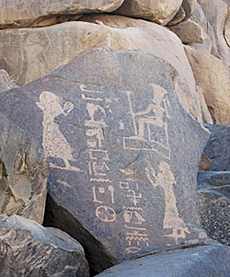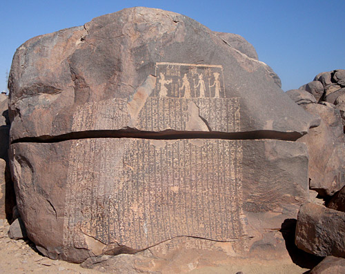 Abb. oben: Auf der Insel Sehel, ein großer Steinblock, die sog. "Hungersnotstele", mit Hieroglyphen-Inschriften und einer Darstellung der Göttin Anuket (ganz rechts oben). Die Hungersnotstele auf der Nilinsel Sehel liegt im Gebiet des 1. Kataraktes an der Südgrenze des alten Ägypten. (Foto: Elvira Kronlob)