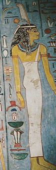 Abb. links: gemalte Darstellung der Göttin Maat, sie trägt die Feder als Attribut auf ihrem Haupt. Grab Ramses' I., Tal der Köinge. (Foto: Elke Bassler)