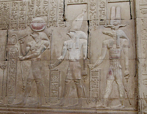 Abb. oben: Sobek (ganz rechts) mit Chons (ganz links) und Horus (mittig).