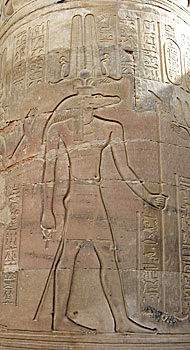 Abb. links: Relief-Darstellung von Sobek in Kom Ombo. Er trägt seine Attribute als Kopfschmuck: hohe Federn, Hörner, zwei Uräusschlangen und Sonnenscheibe. Desweiteren das Was-Zepter und das Anch-Symbol in seiner Hand. (Foto: Elvira Kronlob)