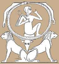 Sito ist der urzeitliche Schlangengott, der die Welt umringelt. Manchmal wird er, so wie auf Abbildung, mit Beinen dargestellt. Detail aus Totenbuch, Neues Reich. (Quelle: "Die ägyptischen Totenbücher" von E. Rossiter")