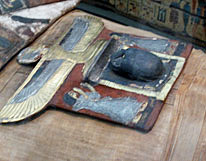 Abb. links: ein schwarzer steinerner Skarabäus, liegend als Schutzsymbol auf der einbandagierten und für's Jenseits zurecht gemachten Mumie.