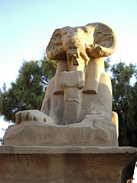 Abb. links: Widderstatue in der Widderallee Karnaktempel. (Foto: Carmen Wolfram)