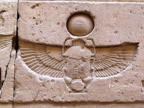 Der Skarabäus war ein Symbol der Sonne. Auch Pillendreher genannt, erlangte der Skarabäus im alten Ägypten große Bedeutung; obwohl nur ein verhältnismäßig kleines wirbelloses Tier. Das hängt damit zusammen, dass der Skarabäus-Käfer eine Kugel aus Dung (Mistkugel) schafft, die er nicht nur vor sich herrollt sondern auch noch seine Eier darin ablegt, aus denen Larven entstehen und daraus später die jungen Käfer schlüpfen. Ein Vorgang den die alten Ägypter schon früh beobachteten, aber offensichtlich nicht erkannten dass die Käfer aus Larven schlüpfen. Für sie war es aber Anlaß anzunehmen, dass neues Leben, wie schon die Schöpfung (laut Schöpfungsmythen), aus dem Nichts entsteht.